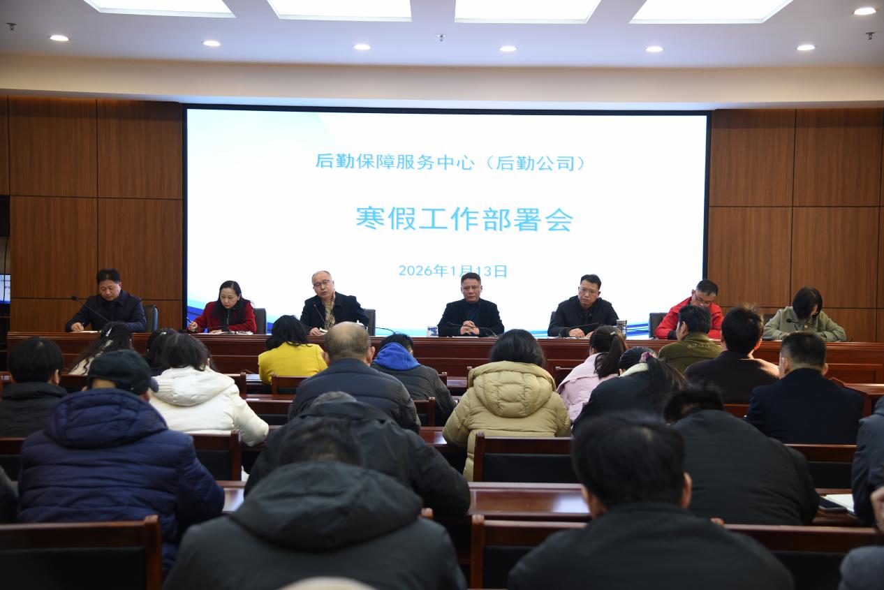 1月13日下午,后勤保障服务中心(后勤公司)在二楼报告厅召开2026年度寒假工作部署会,系统安排寒假期间校园后勤保障服务工作。中心主任、公司总经理赵顶兴主持会议,全体领导班子成员及各部门负责人参加会议。